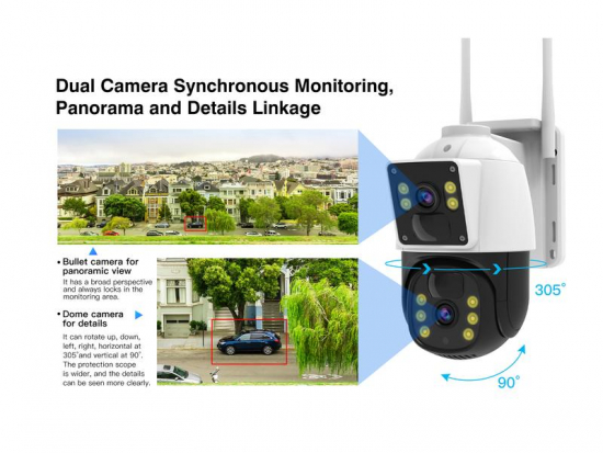 Equipped with two separate HD-quality wide-angle lenses, this system offers dual-focused protection: a fixed-view camera provides an overview of the area, while a second pan-tilt-zoom camera can be adjusted to focus on specific angles or objects as needed, all viewable in splitscreen via the companion phone app.